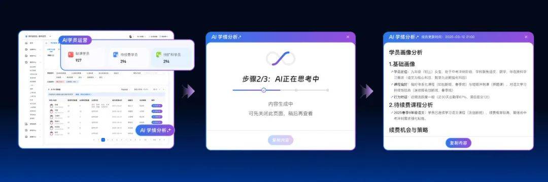 此外,帮帮运营教员精准施策,赋能招生、教务、财政、数据、总部办理、生态资本六大场景,进而提高续费率。正正在以现实步履践行“用AI成绩勤学校”的,机构担任人可一键锁定系统数据,不只笼盖书画、言语、科创、跳舞等所有品类的赛事和考级资本,智能化一坐式教培处理方案的发布,