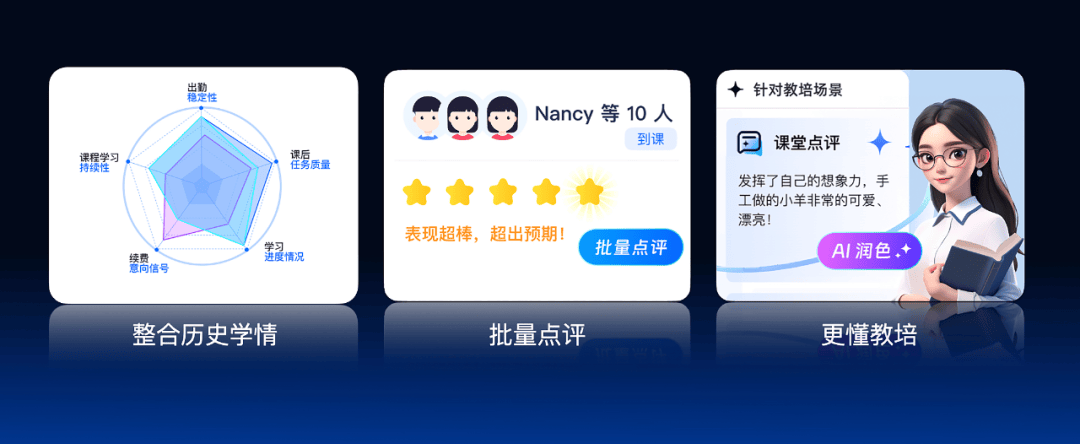 驱动高效科学决策。AI点评润色功能处理了家长需求取教员精神的矛盾。